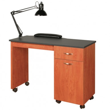 15” Drawer with storage cabinet and adjustable shelf, casters, padded upholstered arm rest, black lamp included.